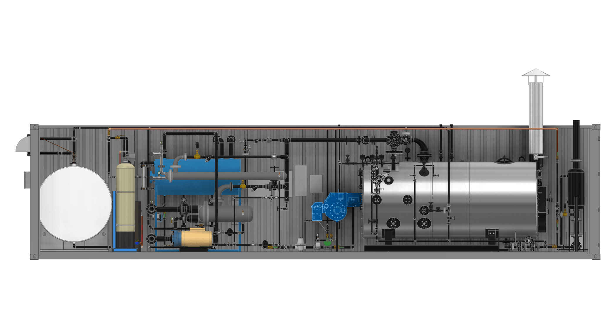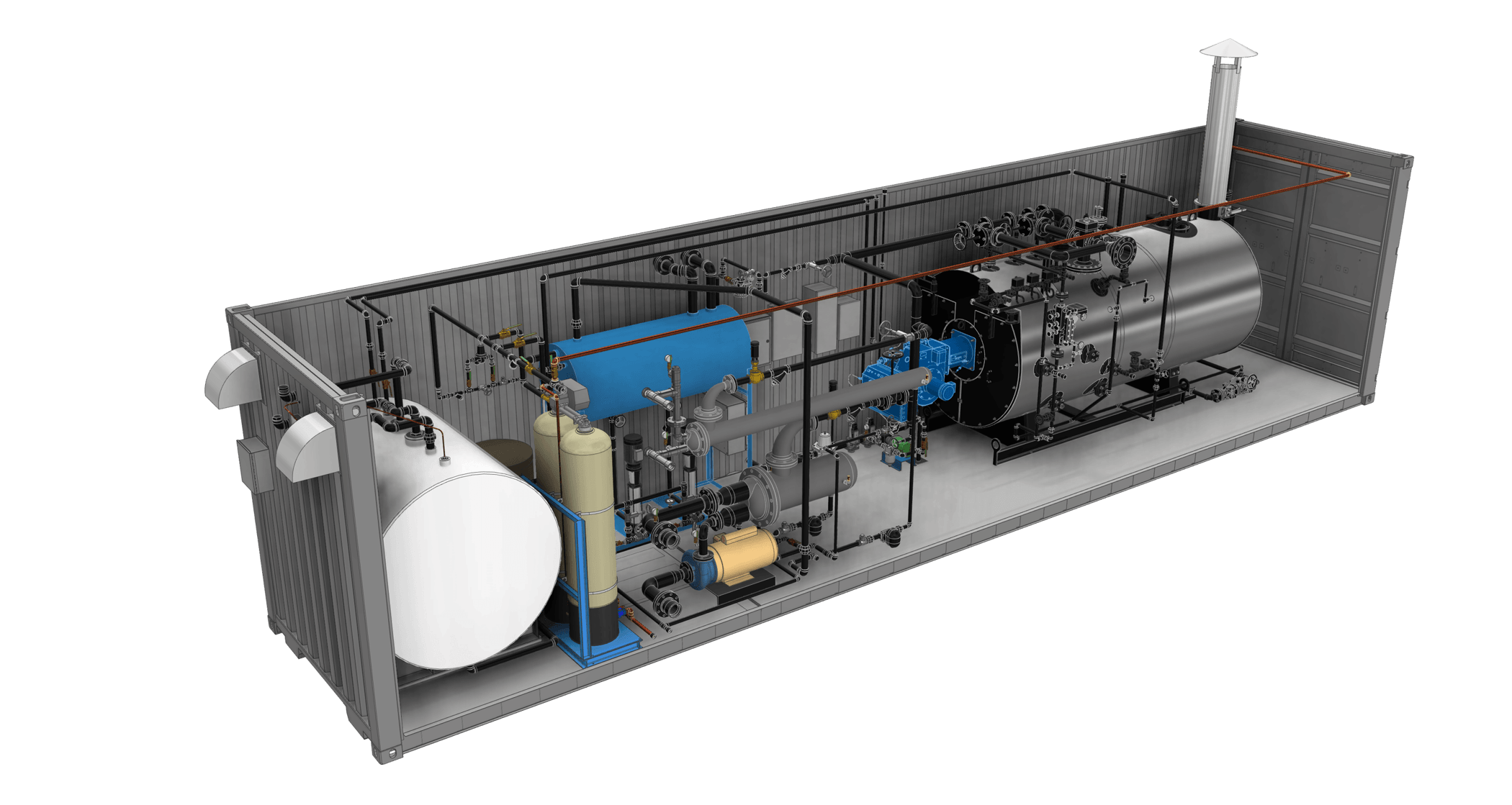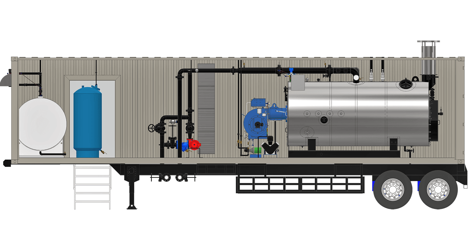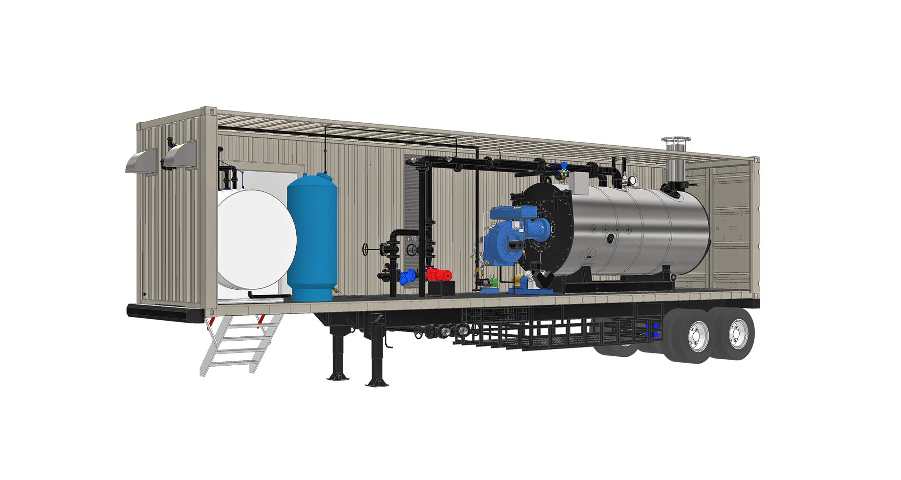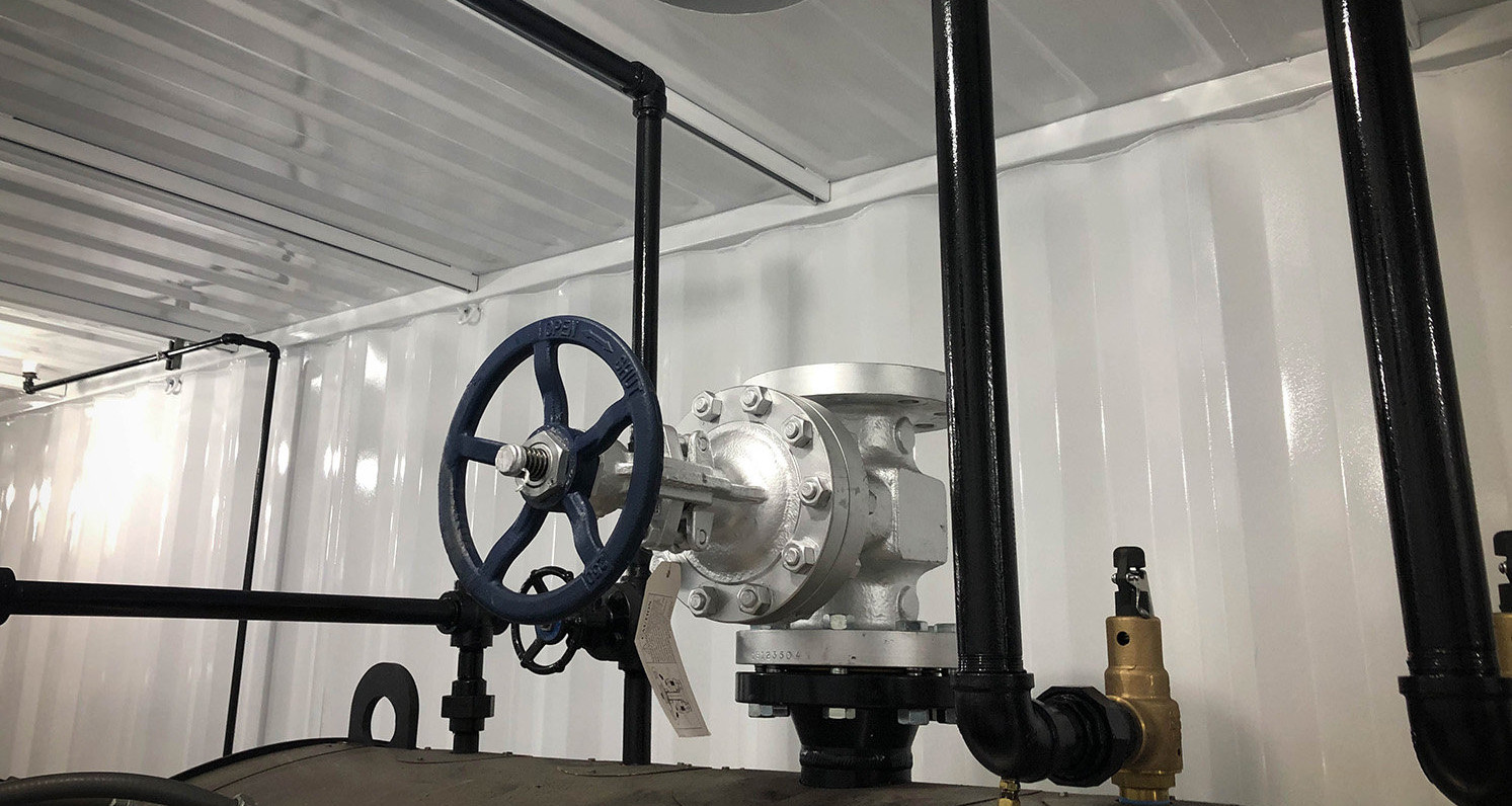 Containerized boiler systems are self-contained, and can be transported with any logistics system capable of handling standard Conex containers. Once they arrive, they only require utility connections, steam hookups, and a place for safe draining of the blowdown. They include: